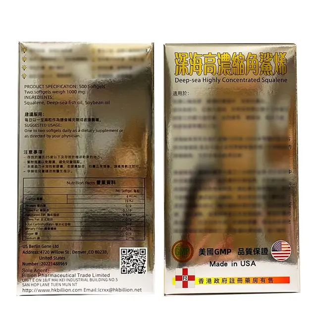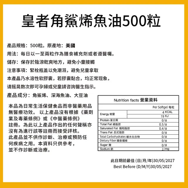 產品成分:角烯、深海魚油、大豆油。