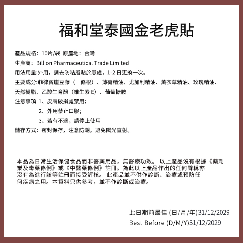 泰國金老虎膏貼小(10cm×7.5cm)