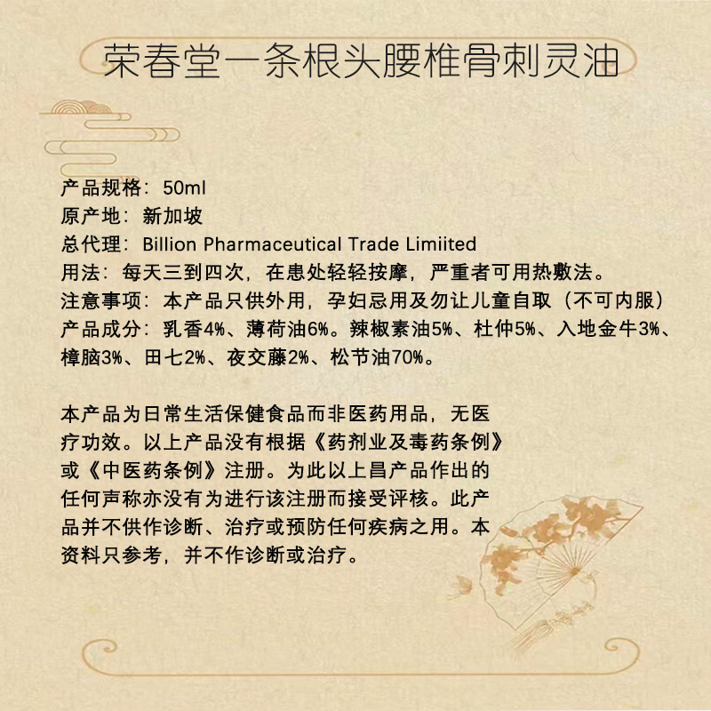 总代理:Billion Pharmaceutical Trade Limiited用法:每天三到四次,在患处轻轻按摩,严重者可用热敷法。